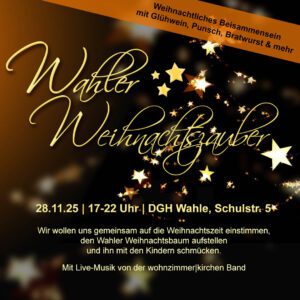 Am 28. November 2025 ist es wieder soweit: Wir laden euch herzlich zum Wahler Weihnachtszauber am DGH Wahle (Schulstraße 5) ein!